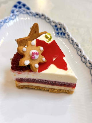 構成:クルミ入りビスキュイショコラ、グリオット入りピスタチオムース、フランボワーズチョコレートムース、フランボワーズグラサージュ、デコール